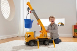 Mechaniczne pokrętła do wysuwania i podnoszenia ramienia oraz wyciągarka z linką zapewniają autentyczną zabawę na „placu budowy” i rozwój motoryki.