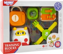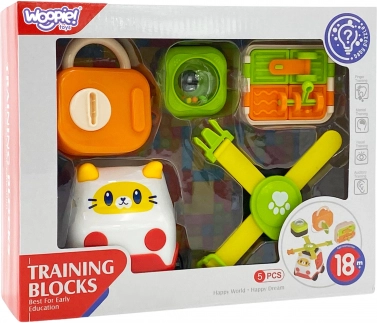 Zestaw obejmuje 4 interaktywne klocki: pomarańczowy zameczek z kluczykiem do ćwiczenia chwytu i koordynacji, okienka z zapinką i suwanym ryglem do poznawania przyczyn i skutków, obrotowy element z kuleczkami dla stymulacji wzrokowej oraz paski z klamrami i pętelkami przypominające śmigiełko do nauki zapinania. Wszystko wykonane z solidnych i bezpiecznych materiałów odpowiednich dla małych dzieci.