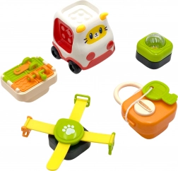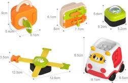 - koci samochodzik + 4 klocki manipulacyjne (zamek z kluczykiem, okienka z zasuwką/suwakiem, element obrotowy z kuleczkami, paski z klamrami i pętelkami)