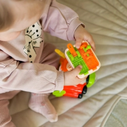 Obracający się element z kolorowymi kuleczkami wspiera śledzenie wzrokowe, a paski z klamrami ćwiczą zapinanie i rozwijają zręczność palców.