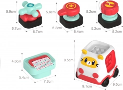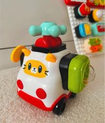 - samochodzik Kotek + 4 klocki manipulacyjne (języczek, obracane kółeczko, przyciskowy dozownik, zakręcane wieczko)