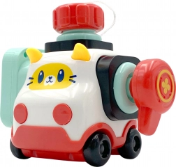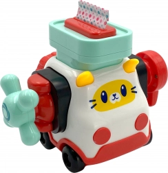 Wesoły samochodzik z kocią buźką i czterema łatwo przypinanymi klockami. Wspiera samodzielność oraz kreatywną zabawę dzieci.