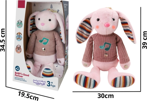 Interaktywny pluszowy króliczek Wooppy ma trzy strefy sensoryczne – na łapkach i brzuszku, które po dotknięciu odtwarzają muzykę. Jego różowe policzki są podświetlane, co tworzy prawdziwie bajkową atmosferę wokół zabawki. Króliczek jest ubrany w sweterek, pod którym znajduje się miejsce na 3 baterie. Ten miękki w dotyku króliczek stanie się przyjacielem dziecka na długie lata.