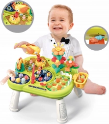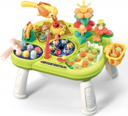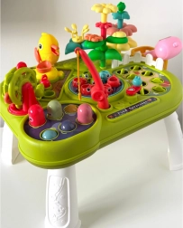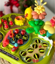 - 8 w 1 (łowienie rybek, wybijanie robaczków, układanie kwiatów, wyciąganie marchewek, karmienie ptaszka, obrotowy młyn, koszyczek na elementy, schowek na robaczki)