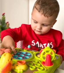 Co czeka dzieci? Łowienie rybek z wędką, wybijanie robaczków młotkiem, segregowanie i układanie kwiatów, zbiory marchewek, karmienie ptaszka, obrotowy młyn, praktyczny koszyczek na elementy oraz schowek na robaczki. Każda aktywność rozwija inne umiejętności i utrzymuje uwagę dzieci bez zbędnych rozproszeń.