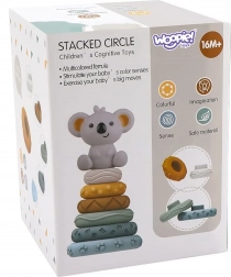 Urocza piramida do układania marki WOOPIE to edukacyjna i bezpieczna zabawka dla najmłodszych. Wykonana z miękkiego, elastycznego i nietoksycznego materiału, sprawdzi się także jako gryzak. Sześć pierścieni o różnych rozmiarach oraz górna figurka koali wspierają percepcję sensoryczną, koordynację ręka-oko i małą motorykę.