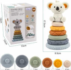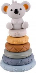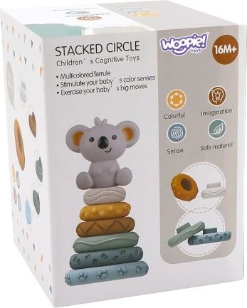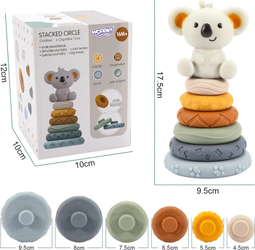 Dzieci mogą układać według wyobraźni lub zgodnie z wielkością pierścieni, dzięki czemu rozwijają rozpoznawanie kształtów i rozmiarów, koncentrację oraz cierpliwość. Delikatne pastelowe kolory i miękka figurka koali czynią z zabawki atrakcyjnego towarzysza na każdy dzień.