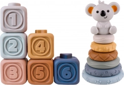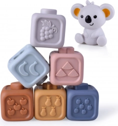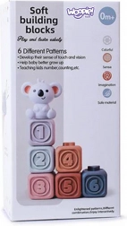 Miękkie silikonowe sensoryczne klocki WOOPIE w delikatnych pastelowych kolorach wspierają wczesny rozwój dziecka już od urodzenia. Sześć klocków z wypukłymi liczbami rozwija dotyk, wzrok i logikę, a bezpieczny materiał służy także jako gryzak podczas ząbkowania. Klocki można piętrować, ściskać (piszczą), łączyć dzięki reliefom i bawić się nimi również podczas zabaw w wodzie. Urocza koala dodaje zestawowi figlarnego uroku.