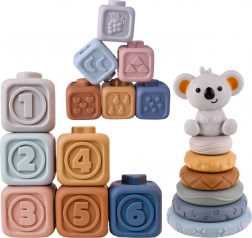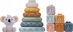 - Sensoryczny zestaw 3w1: pierścienie do układania, miękkie klocki, gryzak