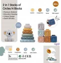 Ta wielofunkcyjna edukacyjna zabawka 3w1 marki WOOPIE obejmuje sześć pierścieni do układania zwieńczonych uroczą figurką koali oraz sześć miękkich silikonowych klocków z wypukłymi cyframi i obrazkami. Dzięki przyjemnej, elastycznej strukturze świetnie leży w dziecięcej dłoni, a jednocześnie służy jako bezpieczny gryzak. Zestaw idealny do codziennej zabawy w domu i w kąpieli.