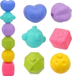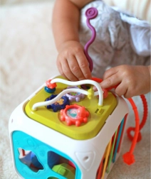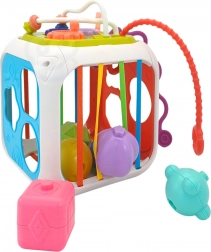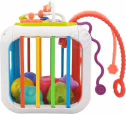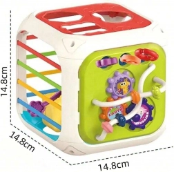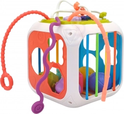 Kostka jest wykonana z wysokiej jakości plastiku ABS i silikonu, jest trwała i bezpieczna dla dziecięcych rączek. W zestawie znajdują się także klocki do sortowania z ukrytymi dzwoneczkami, które zachęcają do eksperymentowania z dźwiękiem, kształtami i kolorami. Odłączana górna część poszerza możliwości zabawy – dziecko może używać jej samodzielnie na macie lub w wózku.