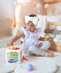Aktywna kostka WOOPIE to przemyślana edukacyjna zabawka, która w jednym kompaktowym kształcie oferuje wiele aktywności do codziennego odkrywania. Od odczepianego górnego panelu z mini ksylofonem, przez zębatki i labirynt z koralikami, po fakturowane sznurki – każda strona dostarcza innego bodźca do rozwoju koordynacji oko–ręka, koncentracji i kreatywności.