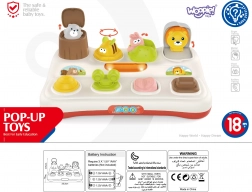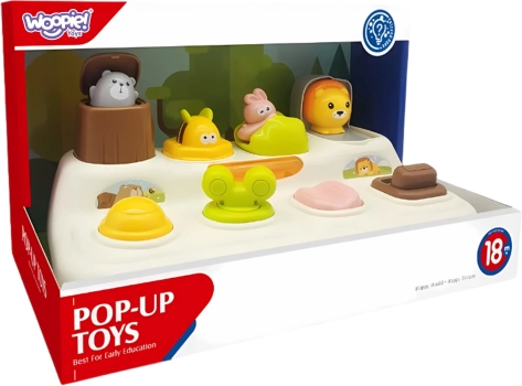 Interaktywna zabawka pop‑up WOOPIE oferuje dzieciom od 18 miesięcy naukę w formie zabawy. Różne elementy sterujące – przełącznik, obrotowe kółko i przyciski – uruchamiają mechanizm, dzięki któremu zwierzątka wyskakują. Dzieci trenują w ten sposób koordynację ręka‑oko, rozwijają percepcję sensoryczną i uczą się, jak ich działanie wywołuje reakcję.