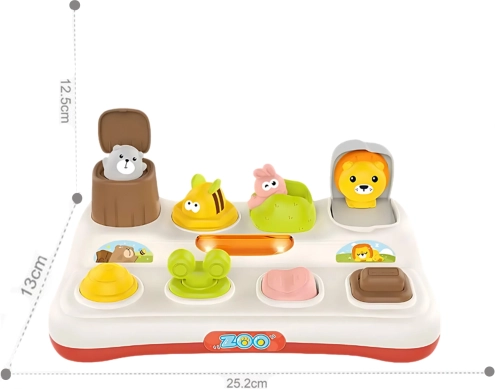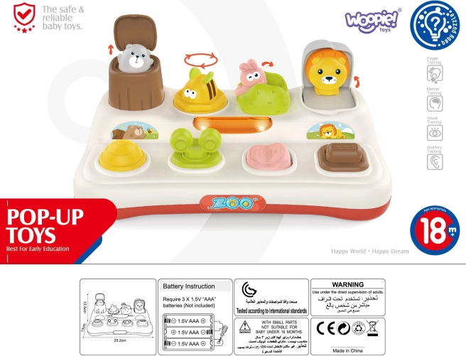 Odkryj zabawę i naukę w jednym z interaktywną zabawką WOOPIE – wyskakujące zwierzątka ZOO. Po aktywacji przełącznikiem, pokrętłem lub przyciskami zwierzątko się wysuwa i zaskakuje dziecko. Zabawka jest wytrzymała, solidnie wykonana i doskonale wspiera motorykę małą oraz zrozumienie związków przyczynowo‑skutkowych.