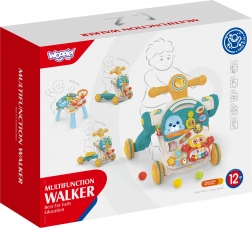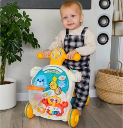 Ta zabawka to prawdziwa studnia niespodzianek, które dziecko może odkrywać samodzielnie. Kombinacja kilku funkcji w jednej zabawce: chodzik, hulajnoga, jeździk i stolik edukacyjny zapewnia, że zabawka szybko się nie znudzi.