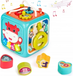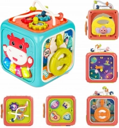 Oprócz funkcji muzycznych kostka zawiera wkładankę z 4 kształtami i literkami, obracany zegar, zębatki, kierownicę z autkiem oraz kulkowy labirynt. Wytrzymały plastik, zaokrąglone krawędzie i nietoksyczne farby zapewniają bezpieczną zabawę od pierwszych miesięcy. Zasilanie: 3× AA (brak w zestawie).