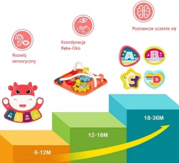 - 6 w 1 (muzyka, piosenki, gra na refleks, dźwięki zwierząt, wkładanka, elementy mechaniczne)
