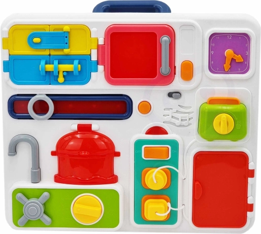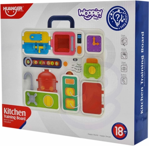 Odkryj zabawną i edukacyjną zabawkę dla najmłodszych: kuchenny panel manipulacyjny WOOPIE BABY, który rozwija małą motorykę, percepcję sensoryczną i koordynację. Dzięki efektom świetlnym i dźwiękowym, funkcjonalnym przyciskom, przełącznikom i pokrętłom dzieci bezpiecznie poznają świat dorosłych – od „podłączania” wtyczki, przez ustawianie kuchenki, po zabawę zegarem.