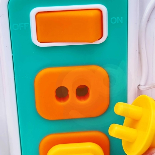 Obrotowe pokrętła, przełączniki i symulowane gniazdka uczą związku przyczynowo-skutkowego oraz rozwijają małą motorykę bez ryzyka.