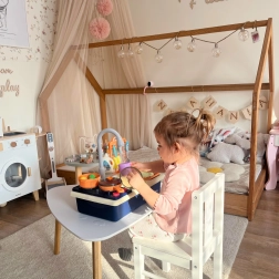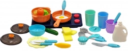Rozbudowany zestaw akcesoriów, takich jak garnki, naczynia i warzywa, pomaga rozwijać dziecięcą wyobraźnię i kreatywność.