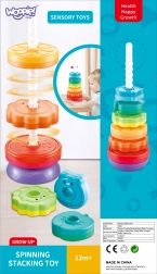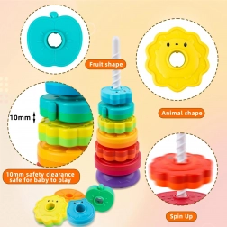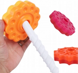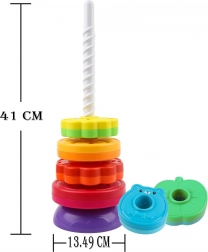 - Zestaw zawiera sześć pierścieni o różnych kształtach, które można układać jeden na drugim, tworząc kolorową, obracającą się piramidę