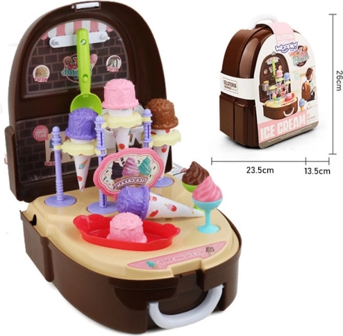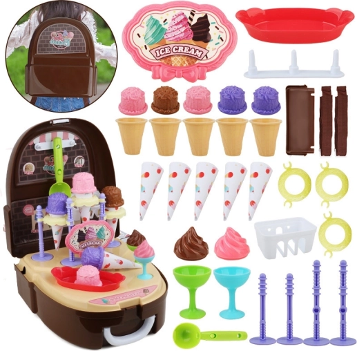 Mały cukiernik zawsze gotowy! Ten uroczy zestaw w formie plecaczka po otwarciu zmienia się w kompletną lodziarnię i mini sklepik. Dzieci mogą serwować lodowe gałki, napełniać rożki i sprzedawać słodkie przysmaki kolegom i rodzicom. Dzięki lekkiej konstrukcji łatwo zabiorą go na plac zabaw, do babci lub na wakacje.