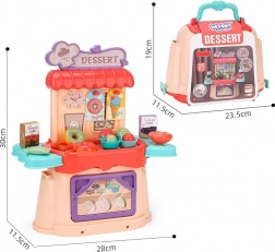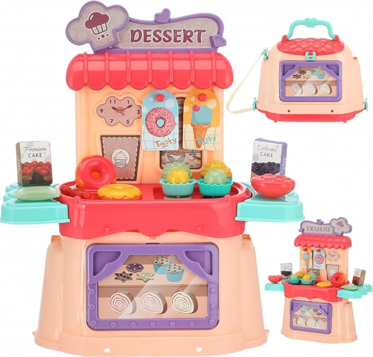 Ten kolorowy zestaw wprowadza dzieci w świat słodkości – od donutów i babeczek po lody – a jednocześnie oferuje praktyczną konstrukcję, która w kilka chwil zmienia się z kompaktowej walizki w pełnowartościowy blat. Dzięki paskowi na ramię dzieci wygodnie go przeniosą i mogą otworzyć własną mini cukiernię gdziekolwiek chcą.