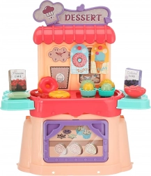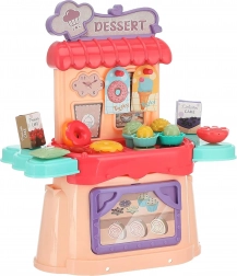 W zestawie znajdują się lody, donuty, słodycze, miseczki, pudełeczka i inne akcesoria do realistycznej zabawy w sklep i cukiernię.