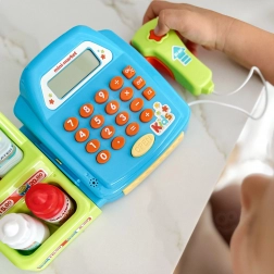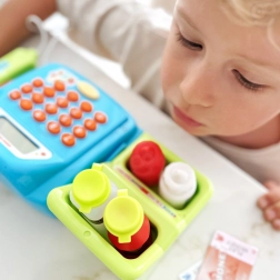 Zabawna i edukacyjna kasa dla dzieci marki WOOPIE z wysuwaną szufladą, działającym kalkulatorem oraz skanerem z dźwiękami. Idealna do zabawy w sklep, rozwijania komunikacji, podstaw matematyki oraz motoryki małej. Dzieci mogą płacić monetami, banknotami lub kartą płatniczą i odkładać towar na praktycznej półce.
