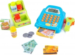 Zestaw zawiera kartę płatniczą, banknoty, monety, pudełko z ciasteczkami oraz półkę z artykułami do kompletnej zabawy w sklep.