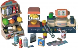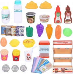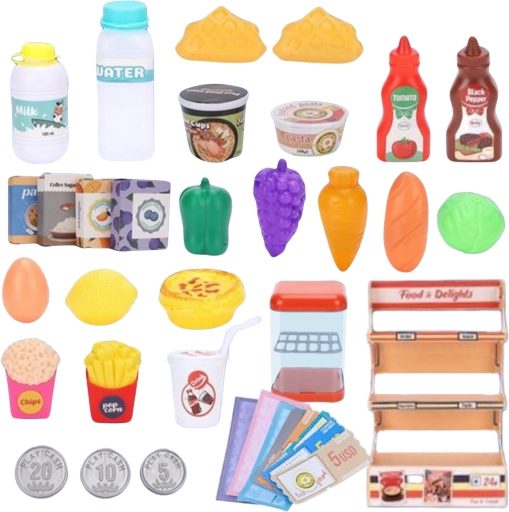 - Bogate wyposażenie (42 elementy): papierowe pieniądze, monety, owoce, warzywa, napoje i inne.
