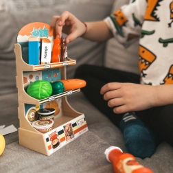 Przejrzyste półki z kategoriami oraz waga stołowa uczą dzieci segregować produkty, ważyć owoce i warzywa oraz obsługiwać klientów.