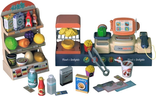 - supermarket z regałem, kasa, skaner kodów kreskowych, waga, papierowe pieniądze, monety, różne produkty (owoce, warzywa, napoje itp.), szczypce do podawania