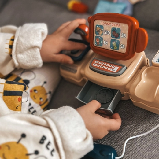 Dzieci mogą „piknąć” towar i usłyszeć autentyczne dźwięki skanowania. Szuflada na pieniądze i przyciski wspierają realistyczną zabawę oraz naukę płatności.