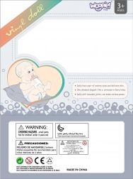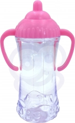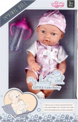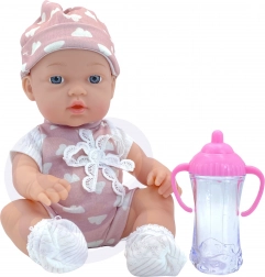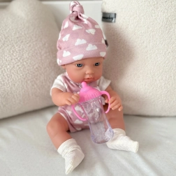 Lalka ma miękkie, gumowe ręce i nogi oraz twarde plastikowe ciałko bez pluszowego wypełnienia, co zapewnia trwałość i łatwą pielęgnację. W zestawie znajdziesz także różową buteleczkę, którą lalka może trzymać w rączkach – idealna do zabawy w karmienie.
