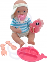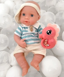 Lalka, miseczka/talerzyk, łyżeczka i widelczyk, smoczek ze sznurkiem, zabawka w kształcie konika morskiego