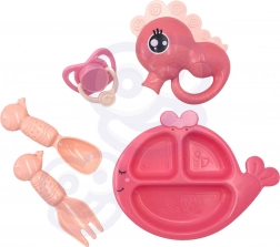 Zestaw zawiera dzielony talerzyk, sztućce, smoczek ze sznurkiem i inne akcesoria, które zamienią zabawę w prawdziwą opiekę.
