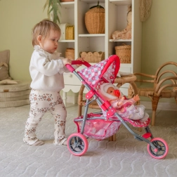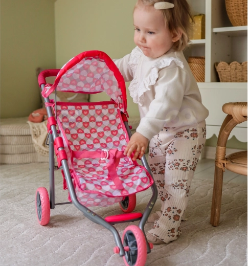 Lekki i stabilny trójkołowy wózek dla lalek marki Woopie zachwyca różowym designem z serduszkami oraz praktycznym wyposażeniem do zabawy w domu i na zewnątrz. Ma składaną budkę, pasy bezpieczeństwa, miękką piankową rączkę oraz dolny koszyk na drobiazgi. Dzięki cichym piankowym kołom łatwo się prowadzi, a po zabawie szybko go złożysz oszczędzając miejsce.