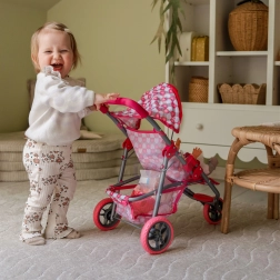 Praktyczne wyposażenie obejmuje składaną budkę przeciwsłoneczną, podnóżek, pasy bezpieczeństwa i pojemny koszyk na akcesoria dla lalki. Ciche piankowe koła są przyjazne dla podłogi i zapewniają dobrą przyczepność. Po zakończeniu zabawy wózek łatwo złożysz i przechowasz.