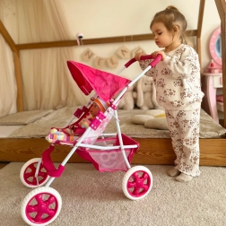 Miękkie koła nie skrzypią i nie rysują podłogi. Praktyczny koszyk pomieści drobiazgi i akcesoria dla lalki.