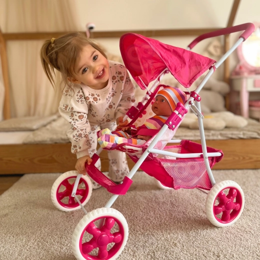 Przemyślane detale, takie jak pasy bezpieczeństwa, podnóżek i pojemny koszyk na akcesoria, czynią z tego wózka praktyczny dodatek do codziennej zabawy. Po zabawie łatwo go złożyć i schować. Zdejmowany tekstylny pokrowiec można zdjąć do łatwej pielęgnacji.