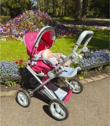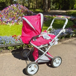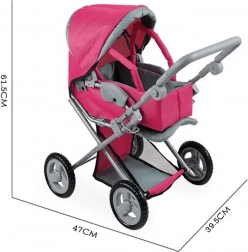 Stylowy różowy wózek dla lalek WOOPIE ROYAL ucieszy każdą małą opiekunkę. Oferuje 3w1 – głęboki wózek, siedzisko spacerowe oraz wyjmowane nosidełko/torbę. Ma regulowaną rączkę dla różnych wzrostów dzieci, ciche koła dla płynnej jazdy, składaną budkę i stelaż oraz praktyczny koszyk na drobiazgi.
