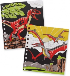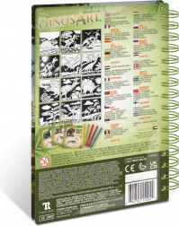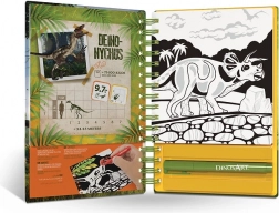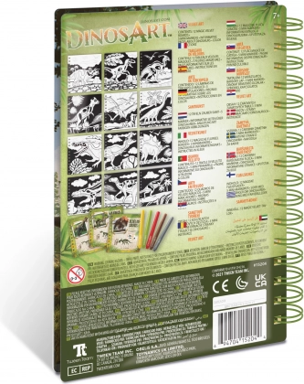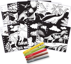 - 12 aksamitnych plansz do kolorowania, 5 mini flamastów, instrukcje, informacyjne strony o dinozaurach