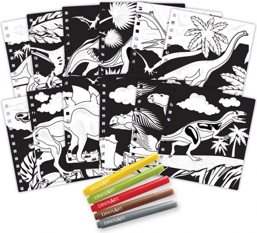 Odkryj kreatywny zestaw dla małych paleontologów: aksamitne kolorowanki DINOSART ze światem dinozaurów. Opakowanie zawiera 12 magicznych aksamitnych plansz, 5 mini flamastów, czytelne instrukcje oraz informacyjne strony o dinozaurach – idealne do zabawy i nauki bez wychodzenia kolorem poza kontury.