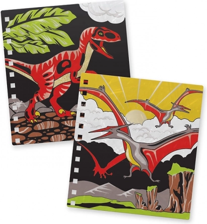 - 12 aksamitnych plansz z motywami dinozaurów – kontrastowy czarny aksamit podkreśla kolory
