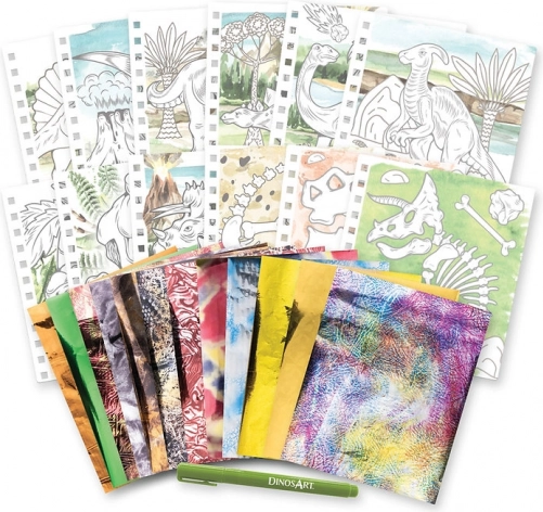 Odkryj kreatywny zestaw dla małych paleontologów: foliowe kolorowanki z motywami dinozaurów od DinosArt. Dzieci za pomocą specjalnego pisaka z łatwością przeniosą błyszczące efekty foliowe na 12 szablonów i stworzą zachwycające obrazki. W zestawie znajdują się instrukcje krok po kroku oraz ciekawostki o dinozaurach – idealny prezent dla twórczych dzieci.