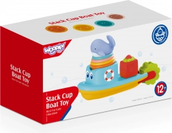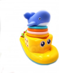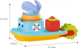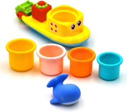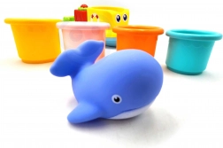 - pływająca łódź z wodnym młynkiem, miękki wieloryb, 4 kubeczki do przelewania
