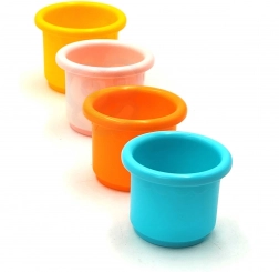 Kubeczki z różnymi otworami tworzą zróżnicowane strumienie wody. Dzieci ćwiczą koordynację, rozpoznawanie kolorów i myślenie logiczne podczas przelewania.