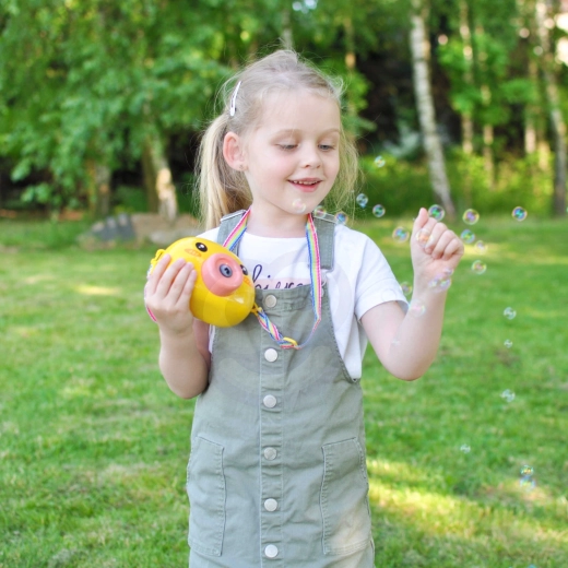 Bańkowa maszynka kurczaczek WOOPIE to idealna zabawka dla dzieci od 3 lat. Prosta obsługa za pomocą przycisku On/Off, obfita produkcja baniek i lekka konstrukcja czynią z niej doskonałego towarzysza do ogrodu, na plac zabaw i dziecięce przyjęcia.