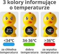 Intuicyjna skala kolorów: niebieski = mniej niż 34 °C, zielony = 34–36 °C, czerwony = więcej niż 36 °C. Ergonomiczny kształt kaczuszki jest przyjazny dla dzieci i bezpieczny do użytkowania w wodzie. Idealny pomocnik do codziennych kąpieli i letnich wodnych zabaw.